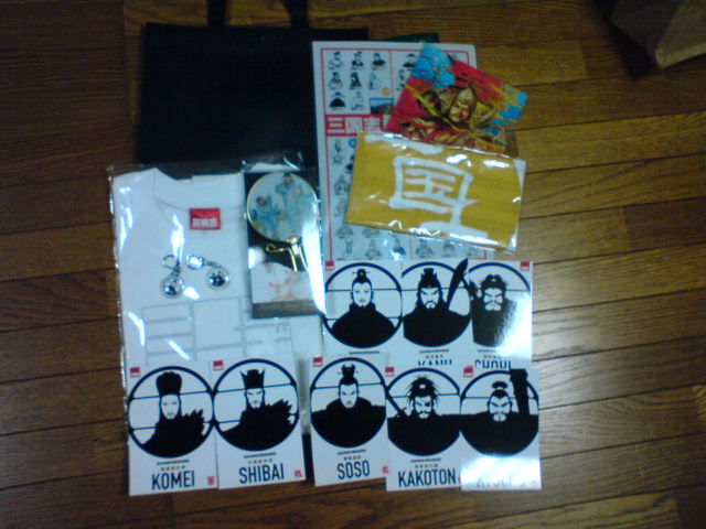 えー上の左から「大三国志展バック」→「横光のクリアファイル(人物紹介バージョン)」→「正子公也の曹操バージョンクリアファイル」→「大三国志展てぬぐい」→下、左から「東京富士美術館限定Tシャツ」→Tシャツに乗っている二つの物体「同じく限定キーホルダー」→「桃園結義が描かれた手鏡」→「限定ポストカード・左上から劉備、関羽、張飛、諸葛亮、司馬懿、曹操、夏侯惇、許褚」えー、呉は買いませんでした(笑)。一国四人チョイスです。呉は孫権、周瑜、甘寧、孫策だったかな。