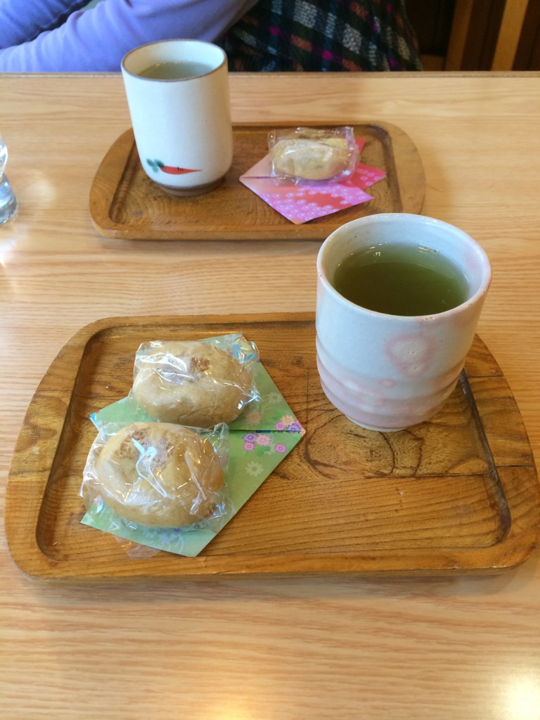 到着時間まで間があったので、温泉まんじゅうとお茶で一服。