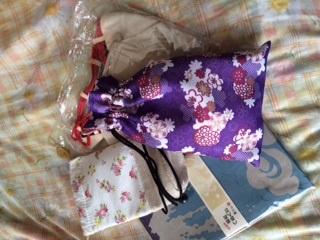 自分で買った巾着袋といつもの旅行先の手拭いなどお土産集。