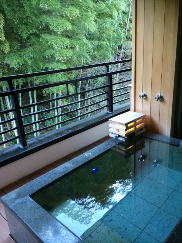 大奮発して、箱根湯本駅近くの、露天風呂付き最上階の部屋を取りました。